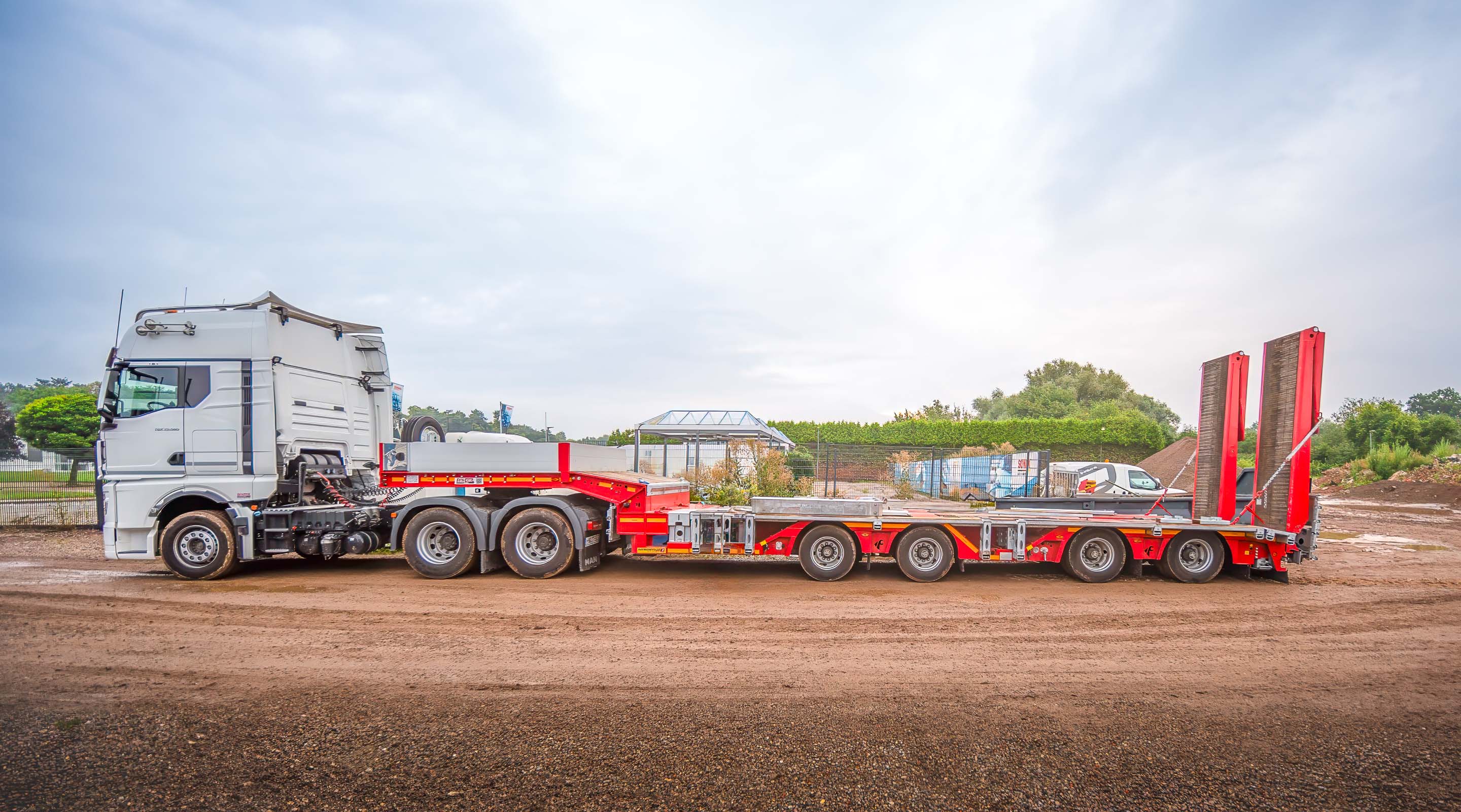 Mit unserem Tieflader befördern wir effizient Bagger, Siebanlagen und Brechanlagen.