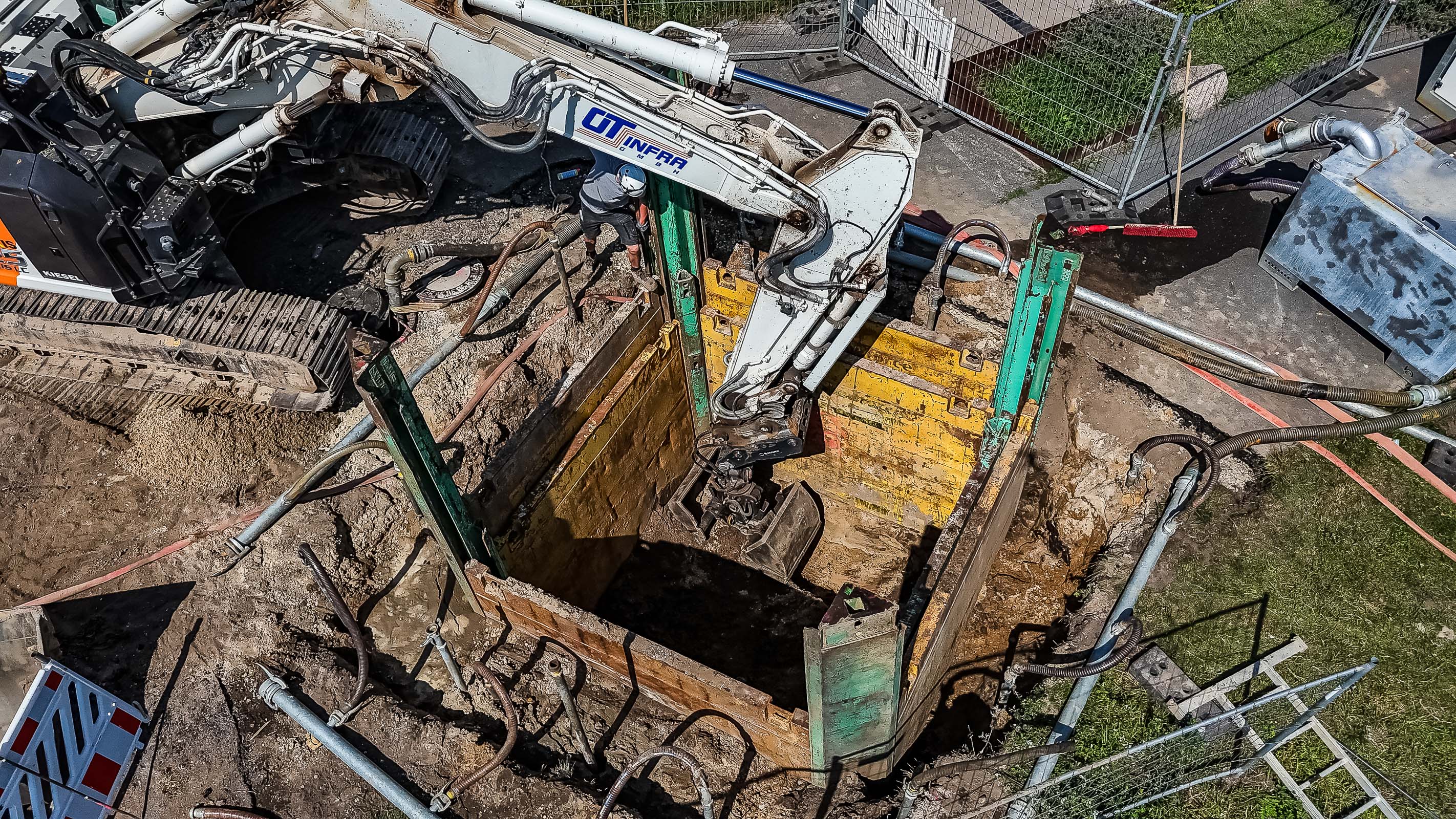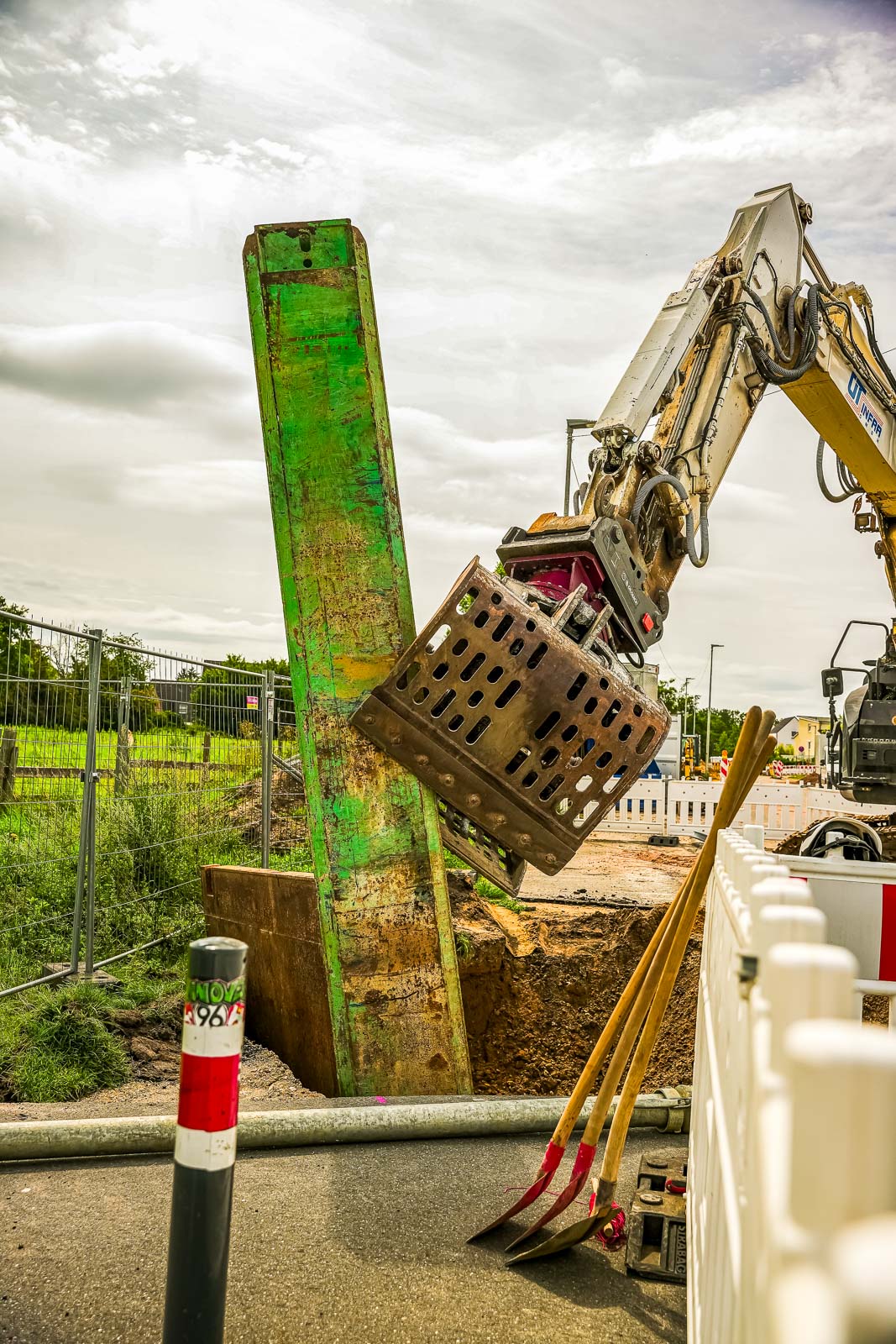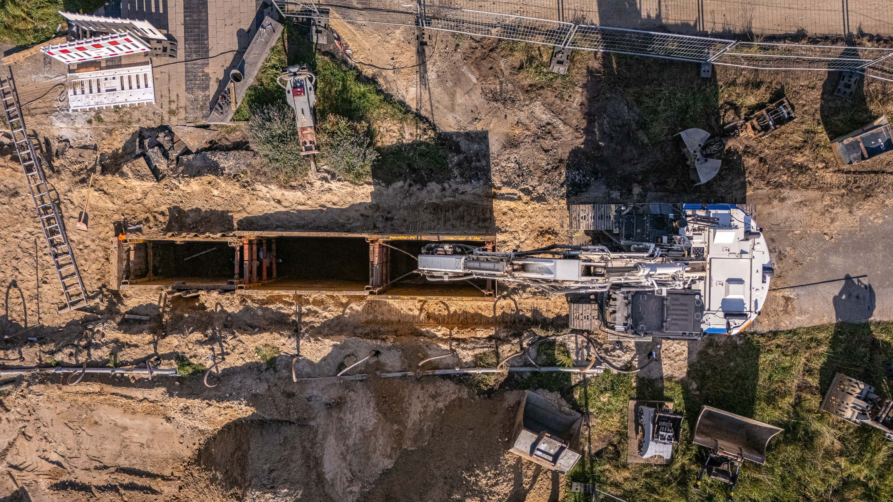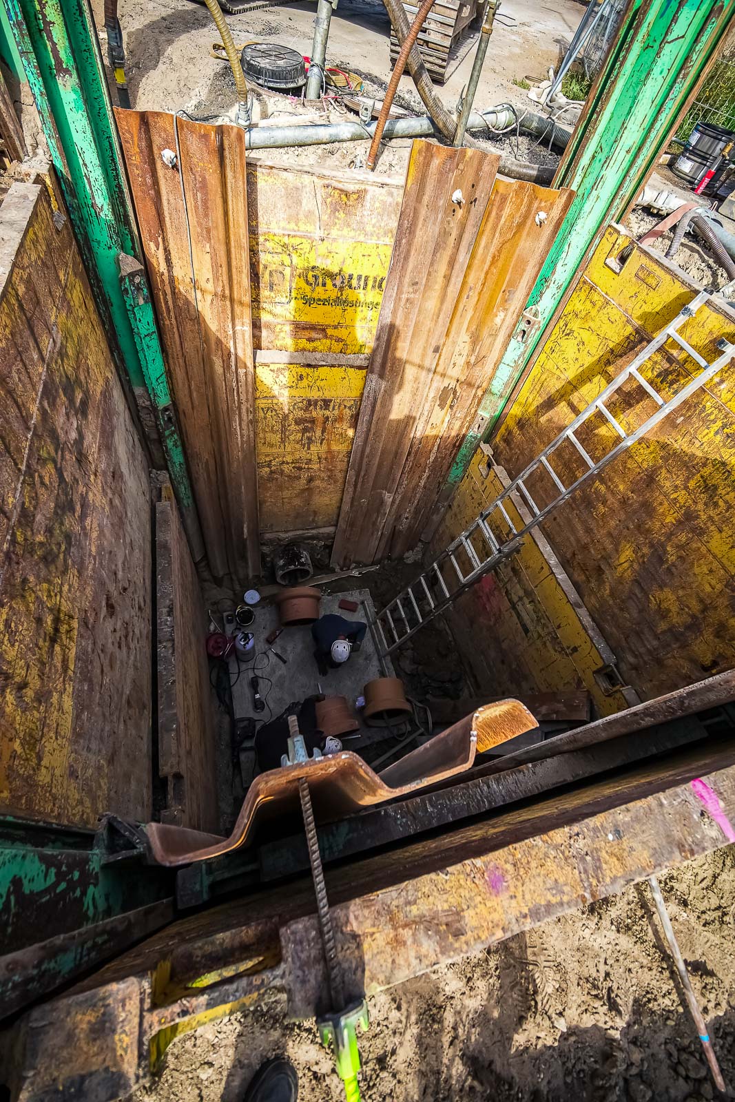 ✅ Maßarbeit beendet: Das Schachtunterteil wurde präzise auf Solltiefe gesetzt und der Kanaldielen-Verbau erfolgreich zurückgebaut.