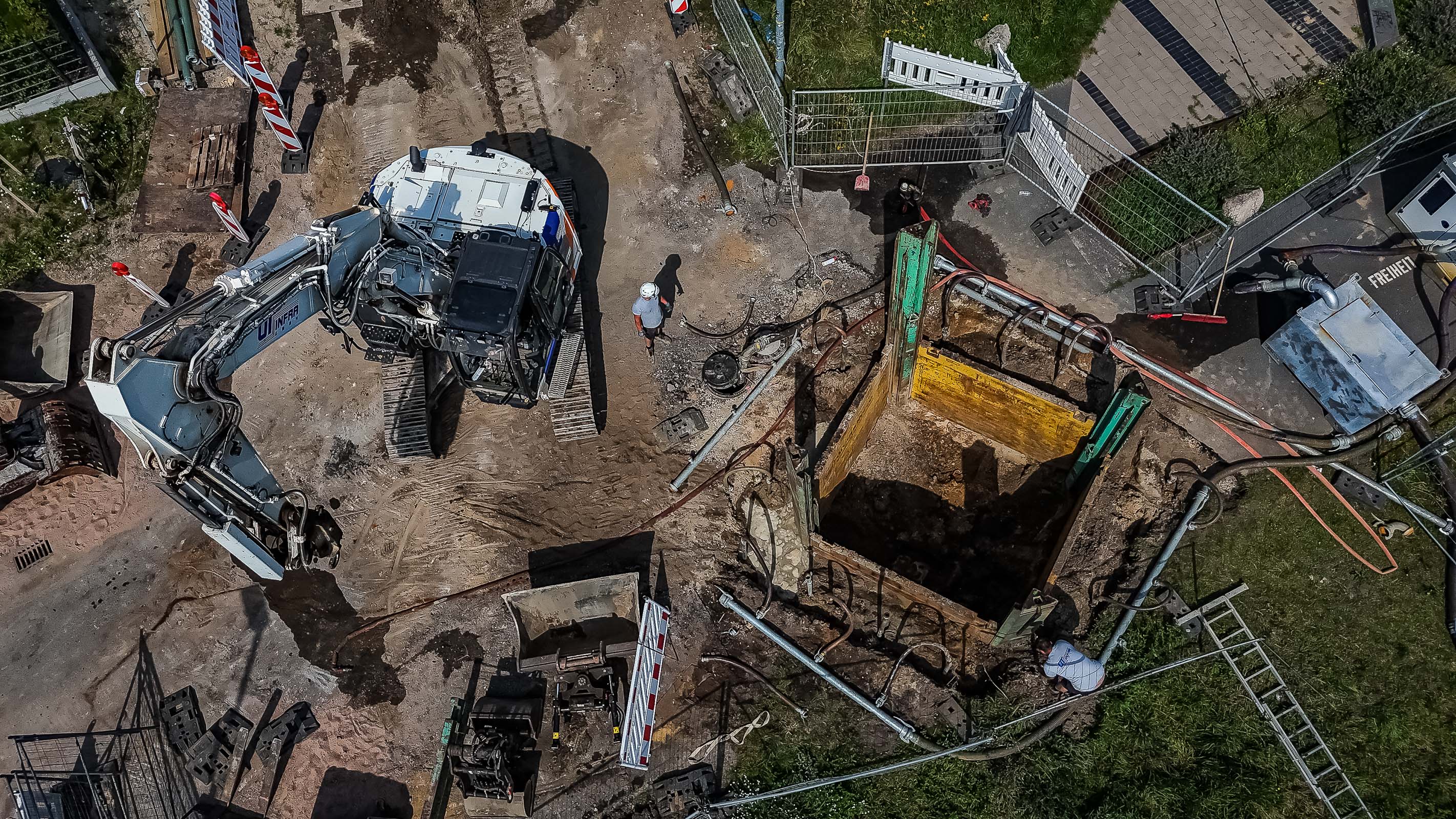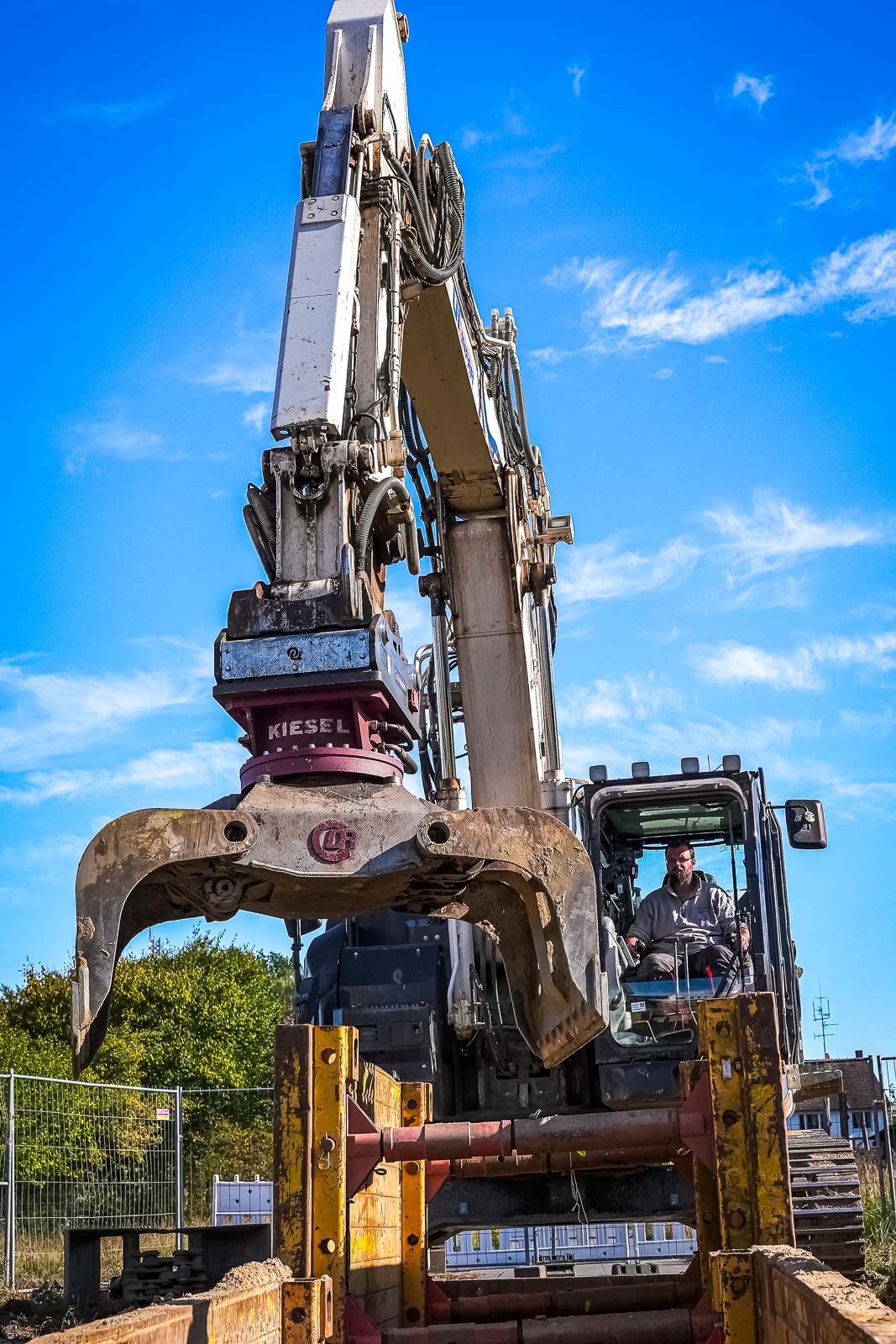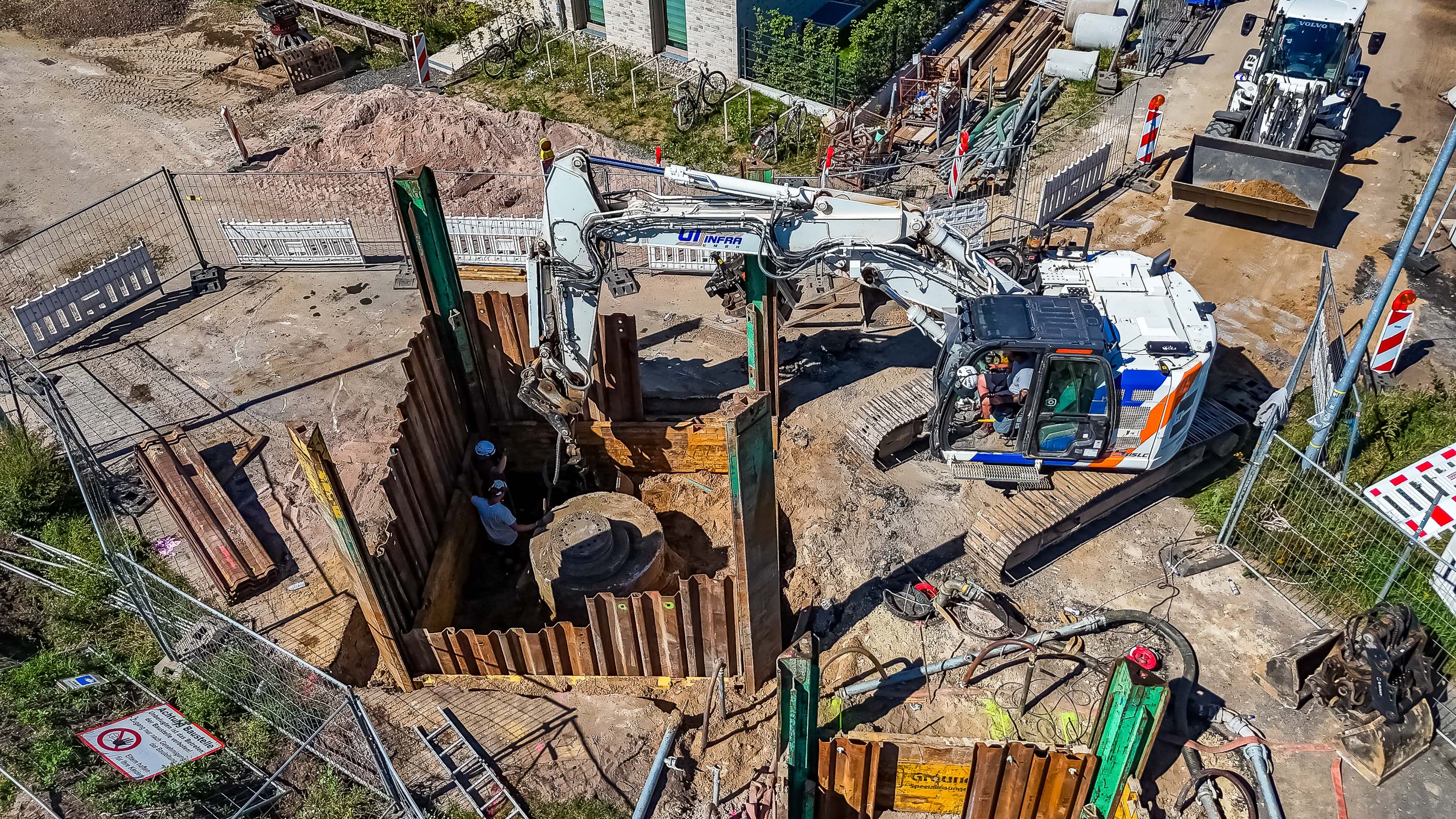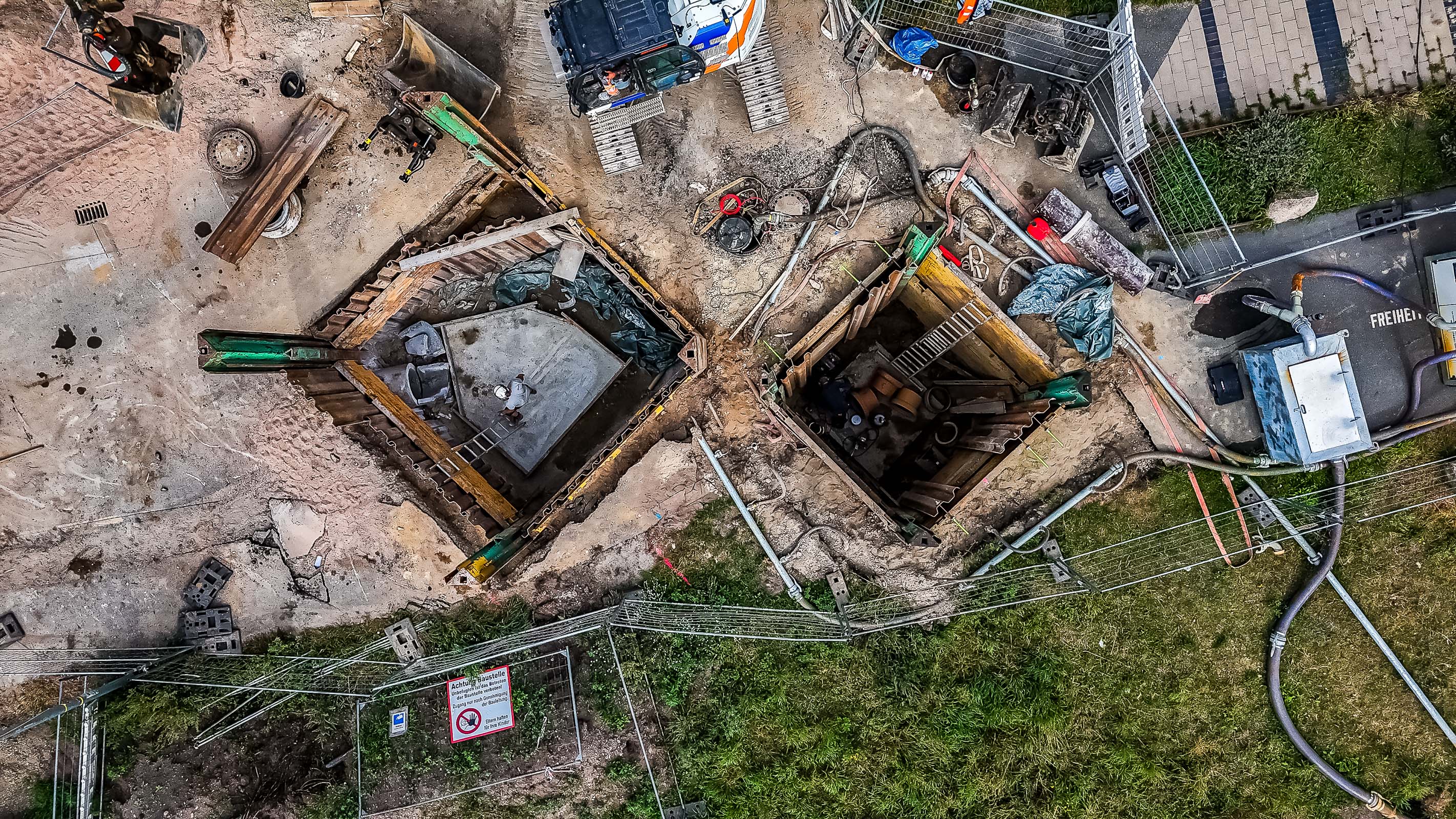 ✅ Maßarbeit beendet: Das Schachtunterteil wurde präzise auf Solltiefe gesetzt und der Kanaldielen-Verbau erfolgreich zurückgebaut.