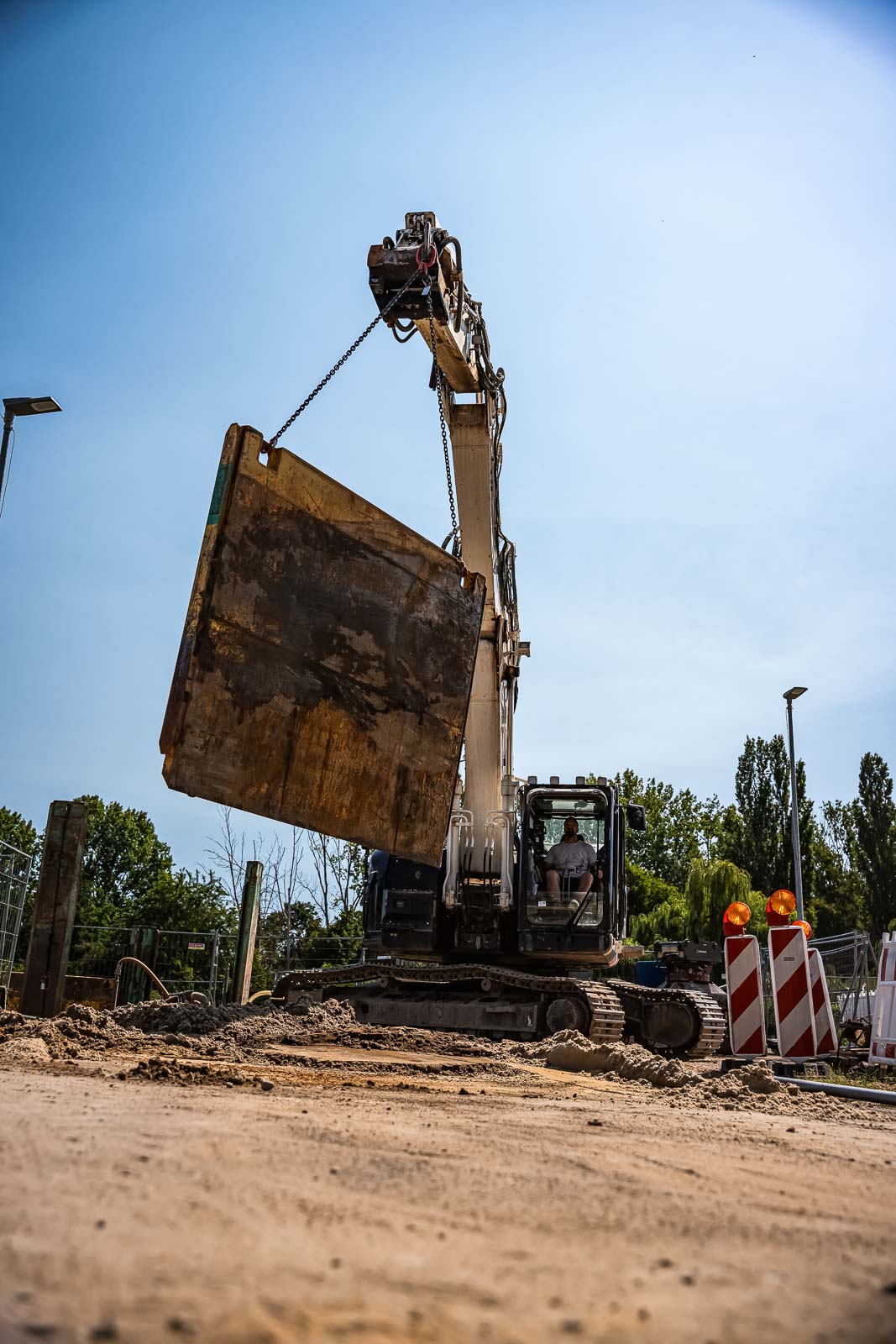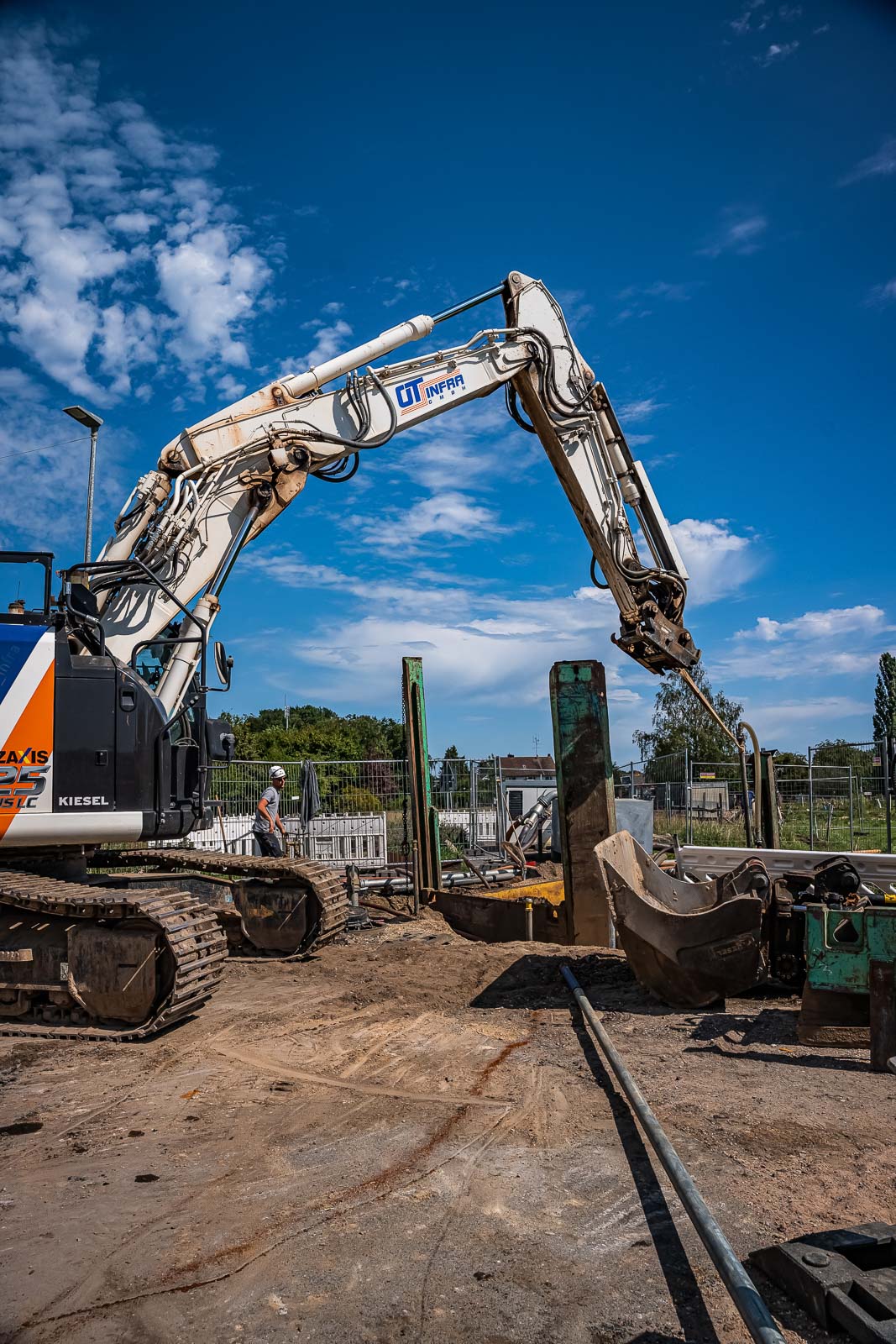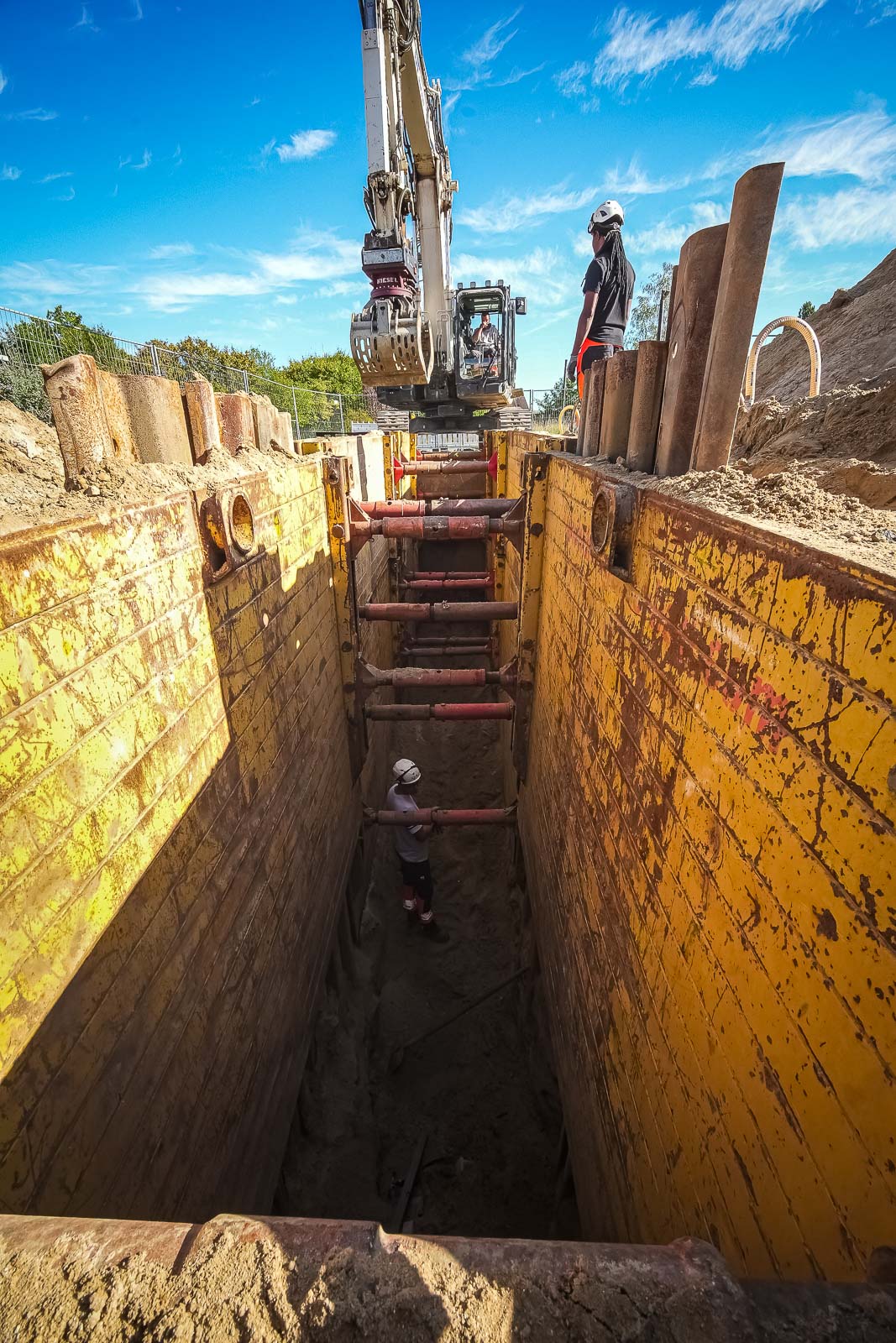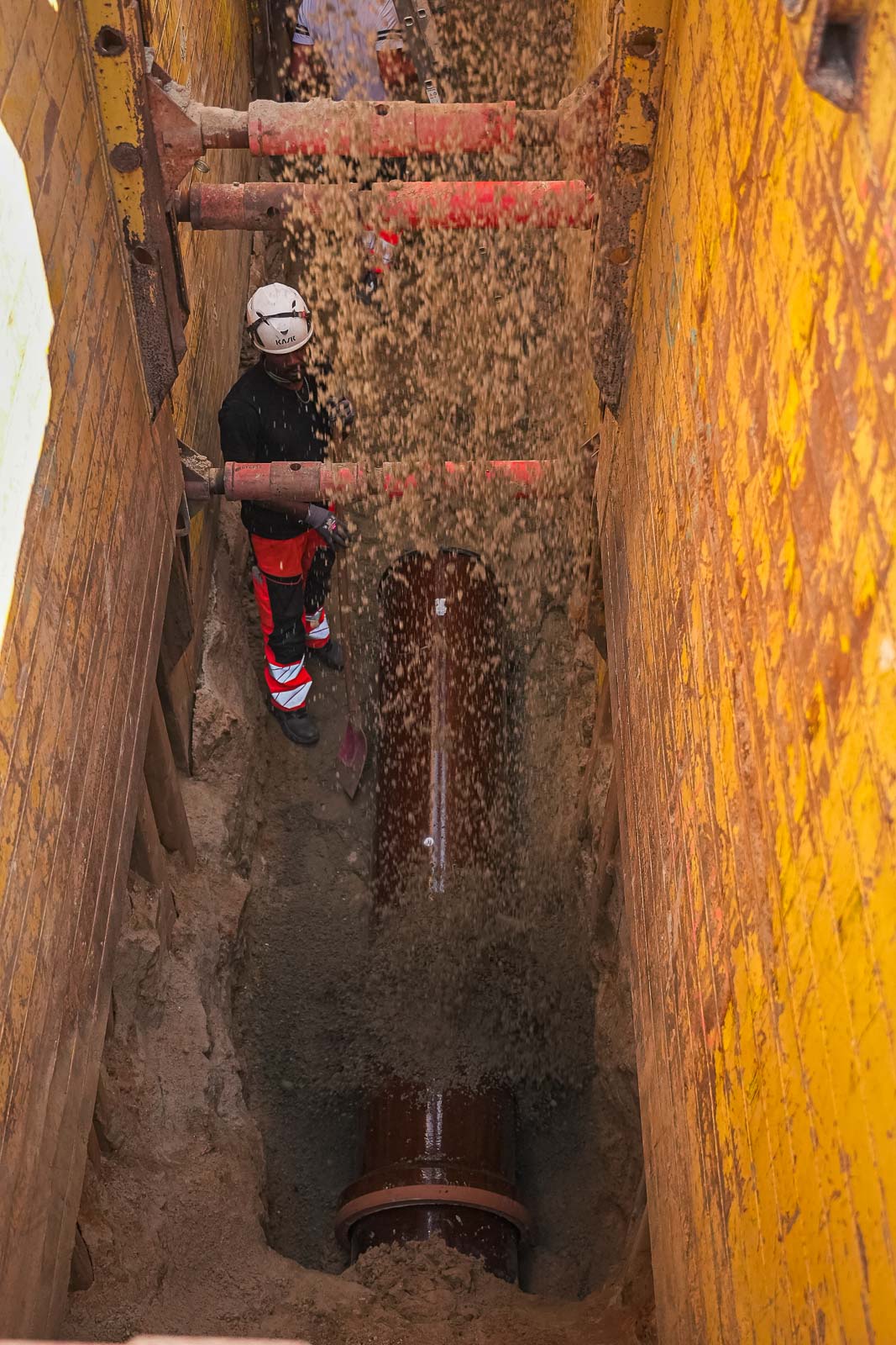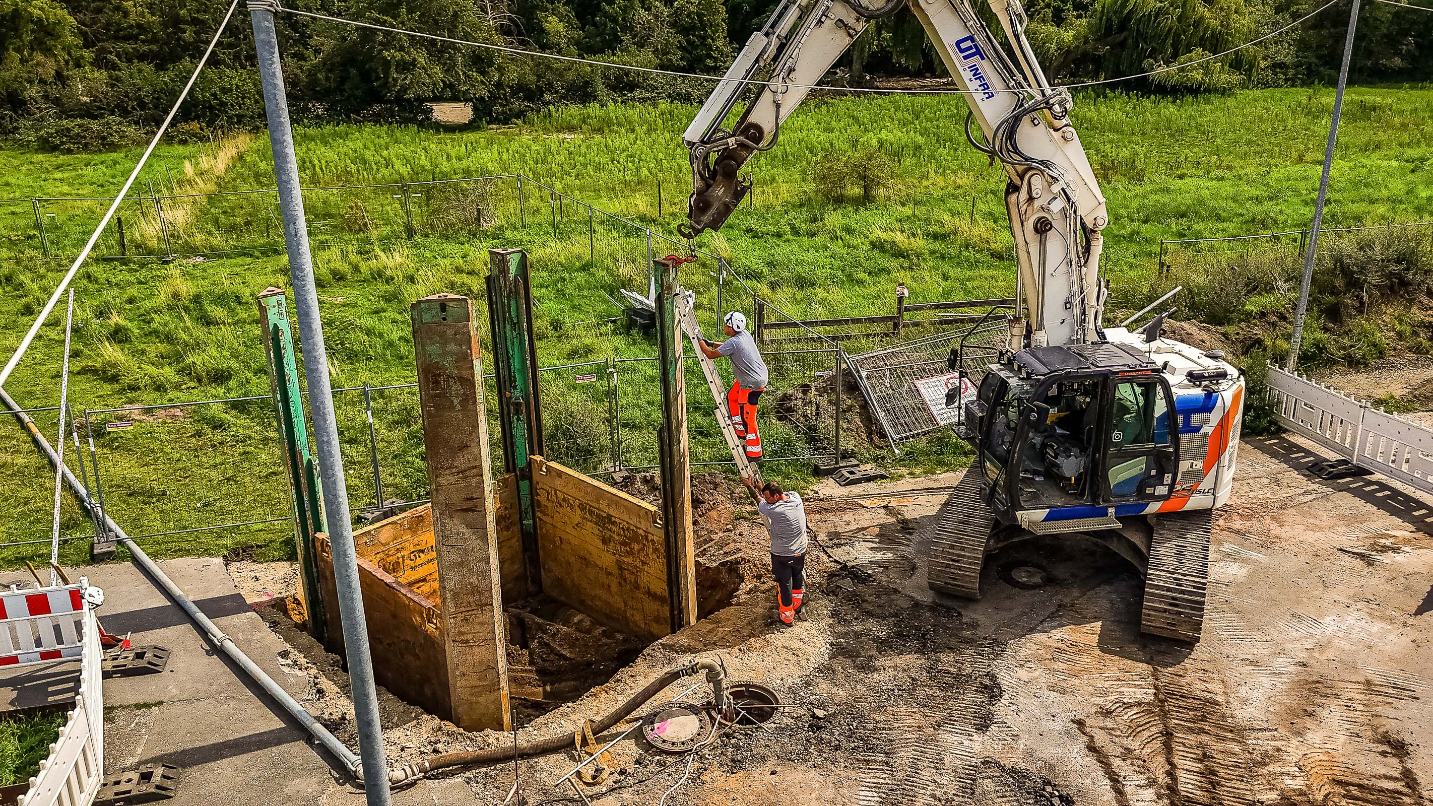 ✅ Maßarbeit beendet: Das Schachtunterteil wurde präzise auf Solltiefe gesetzt und der Kanaldielen-Verbau erfolgreich zurückgebaut.
