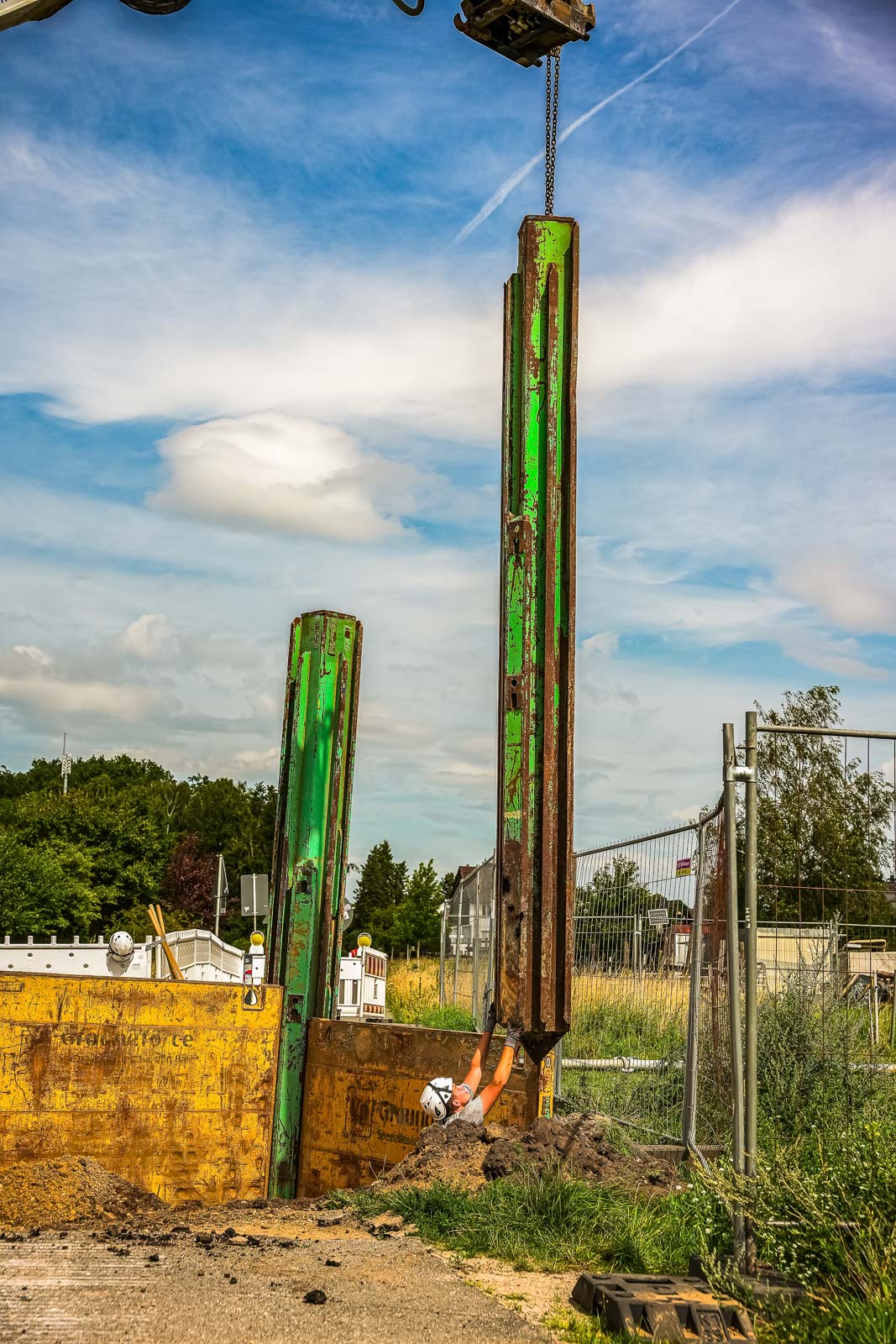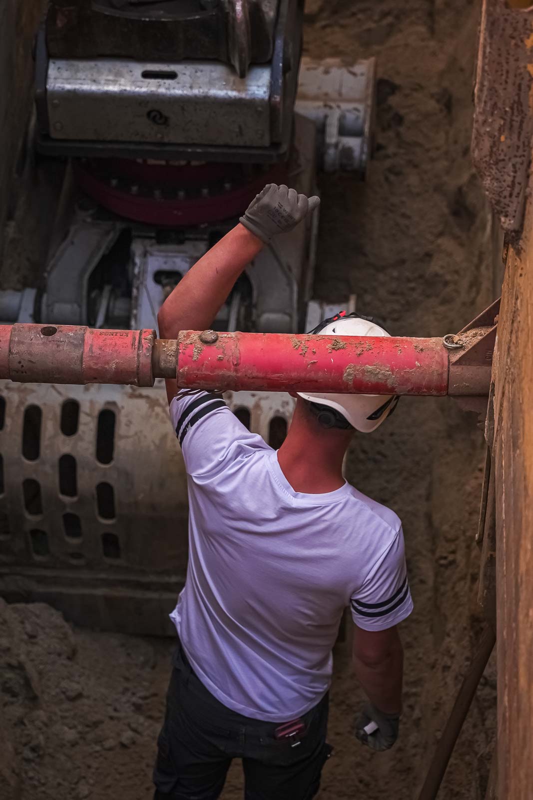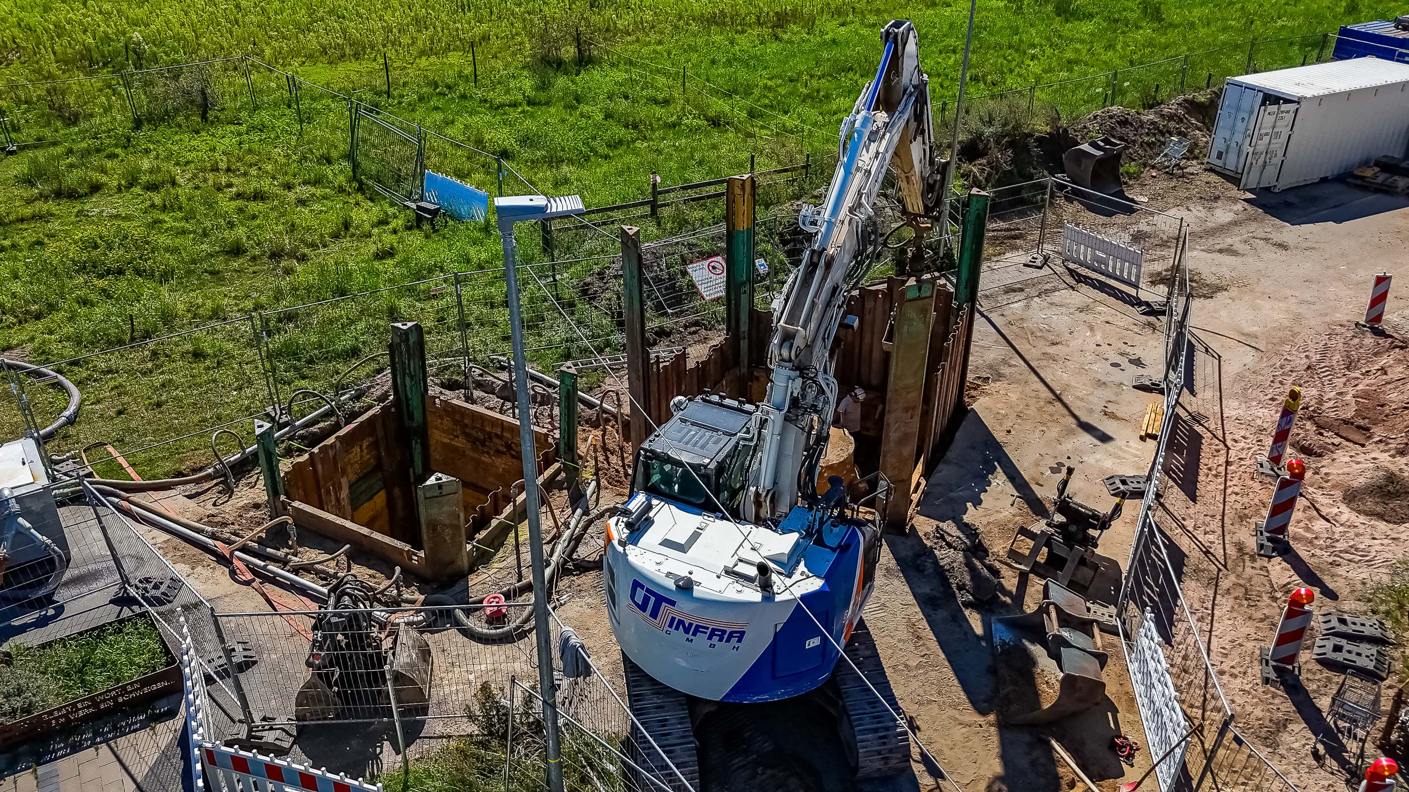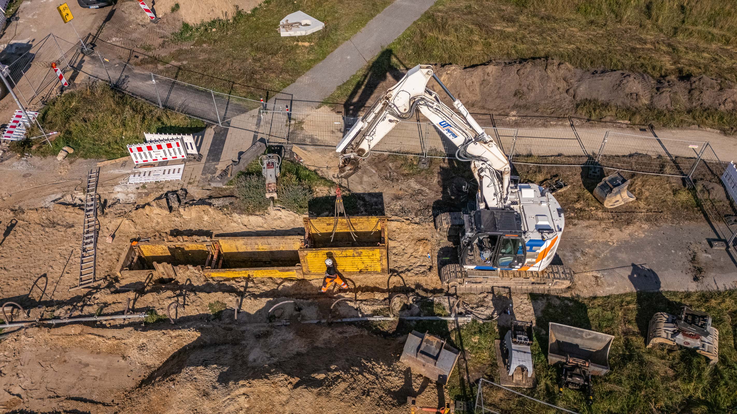 ✅ Maßarbeit beendet: Das Schachtunterteil wurde präzise auf Solltiefe gesetzt und der Kanaldielen-Verbau erfolgreich zurückgebaut.